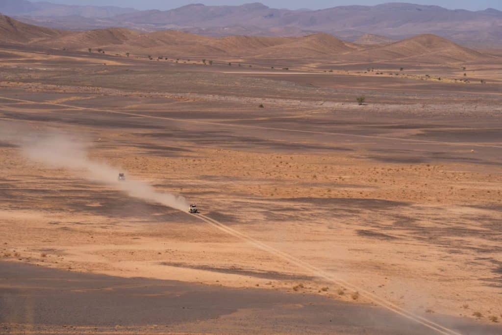 Right from the start, we formed an alliance with another team with whom we shared this adventure until the end of the trip and built a friendship that will last forever. Sharing responsibilities between navigators and drivers allowed us all to ease the pressure when an obstacle arose or when we feared getting lost in this isolated place. So instead of panicking, we shared unforgettable moments of laughter, perfected our communication and listening skills, shared tasty snacks, and grew as people. On the very first day, we had a glitch with our Tripy (the device that counts mileage and validates virtual checkpoints). But thanks to our new friends and the mechanic with whom we became far too friendly, we were able to finish the day and go to the garage in the evening to have the device reconnected properly. In the days that followed, we repaired a few flat tires and dug several vehicles out of the sand, but fortunately, Octo was never involved. He, for his part, experienced several belt problems during the rally, but we always managed to complete the stages despite everything.